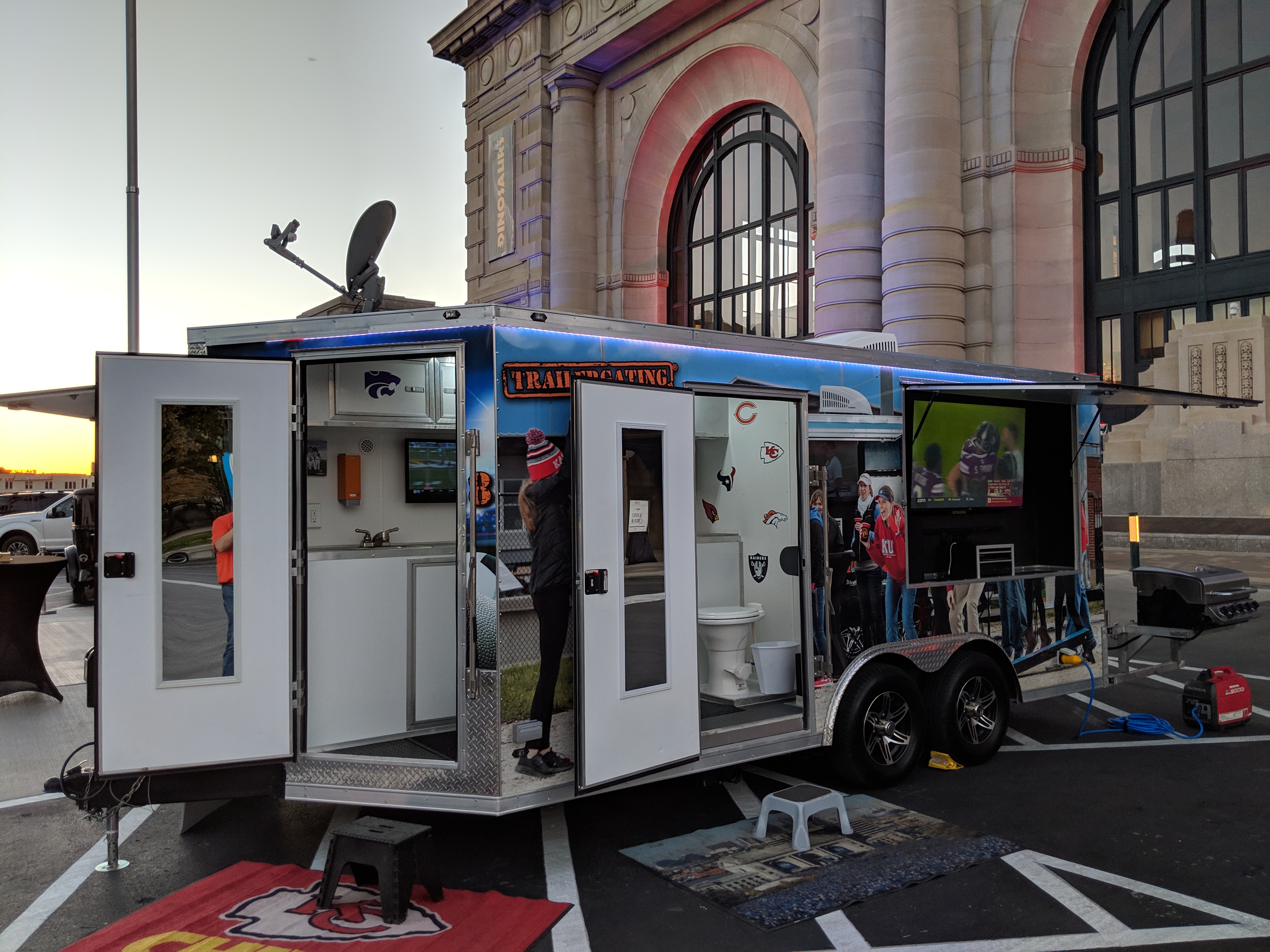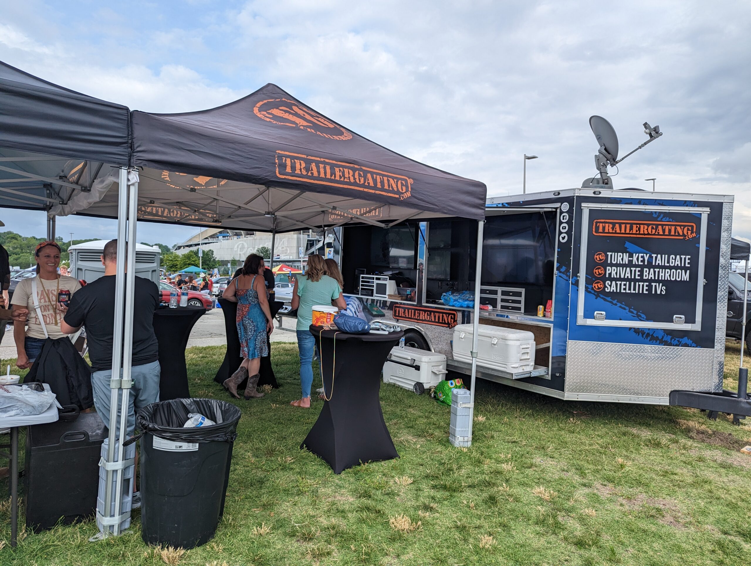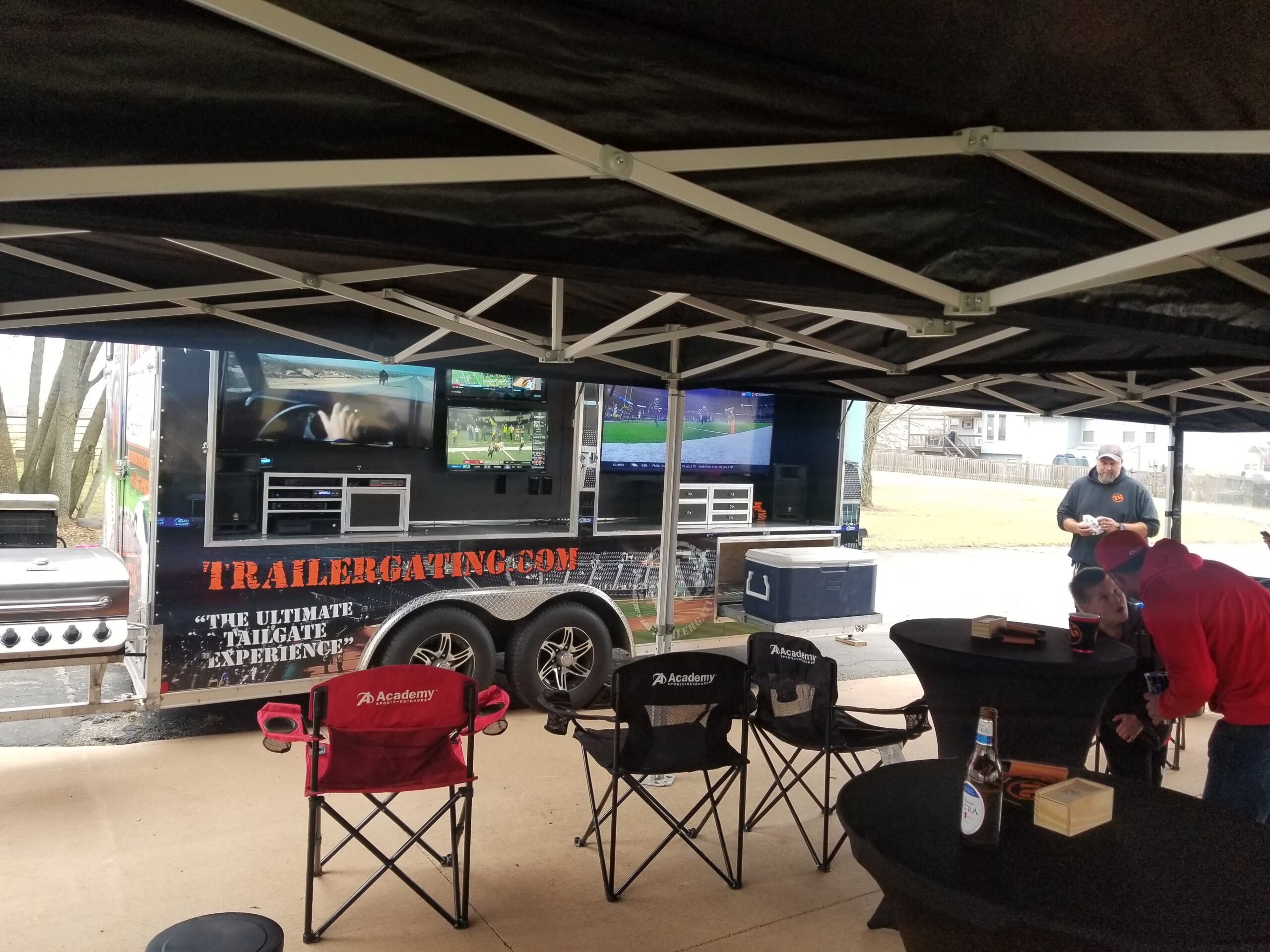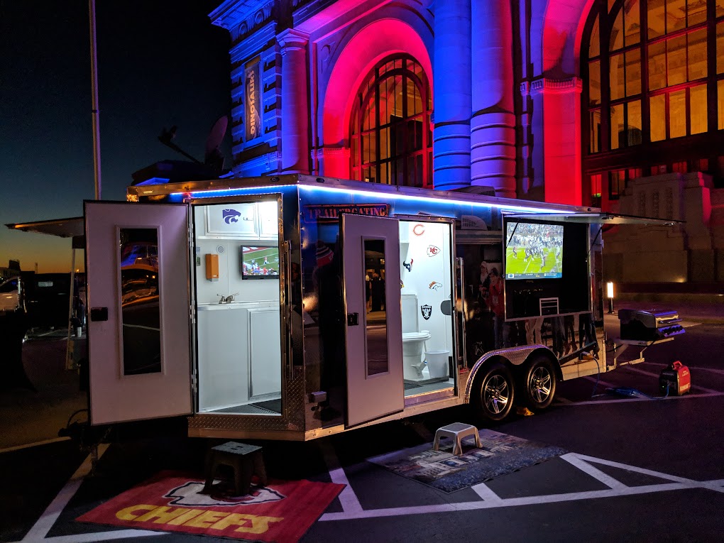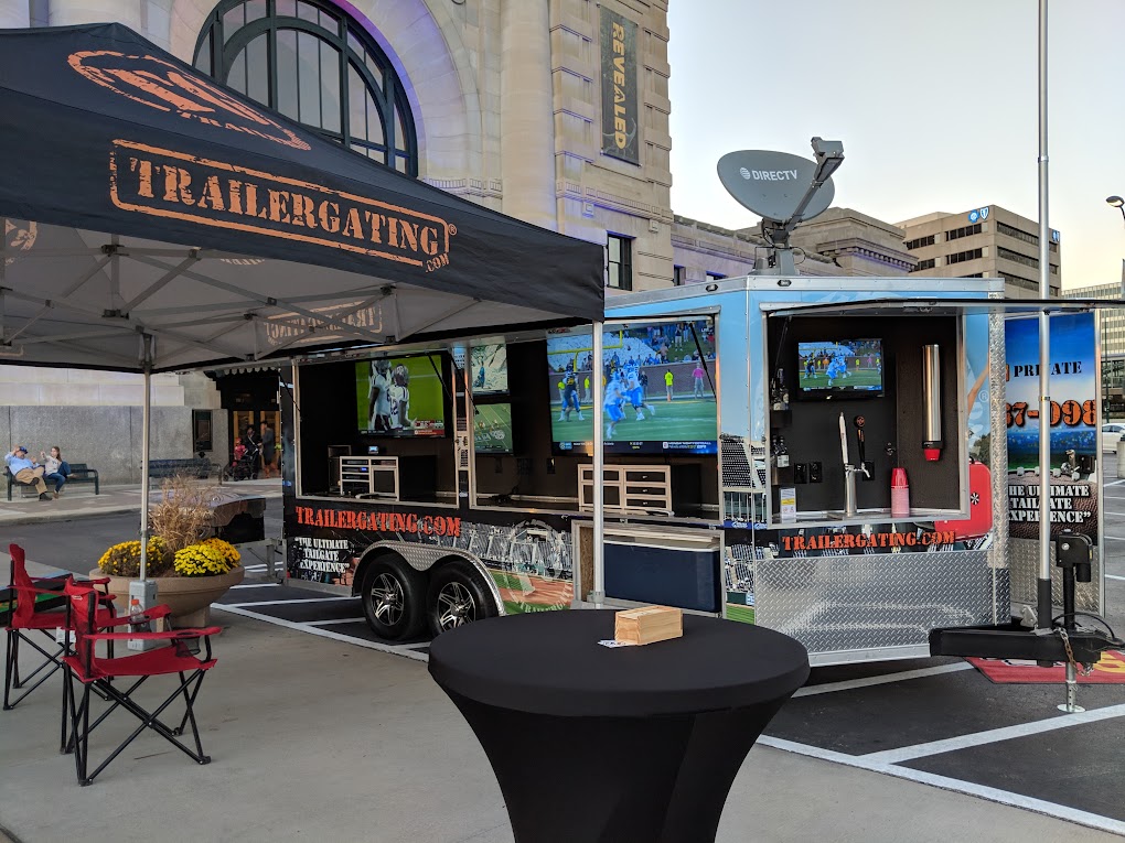 Recommended for events with 40 or fewer guests. This Trailergating Ultimate Tailgate Experience trailer is 10′ long with a total of three TVs. This trailer comes equipped with your own private bathroom with hot and cold running water, two 4-burner gas grills, two beer taps, satellite TV, chairs, tent and tables. The Trailergating Ultimate Tailgate trailer is the life of the party and is the ultimate tailgate experience.