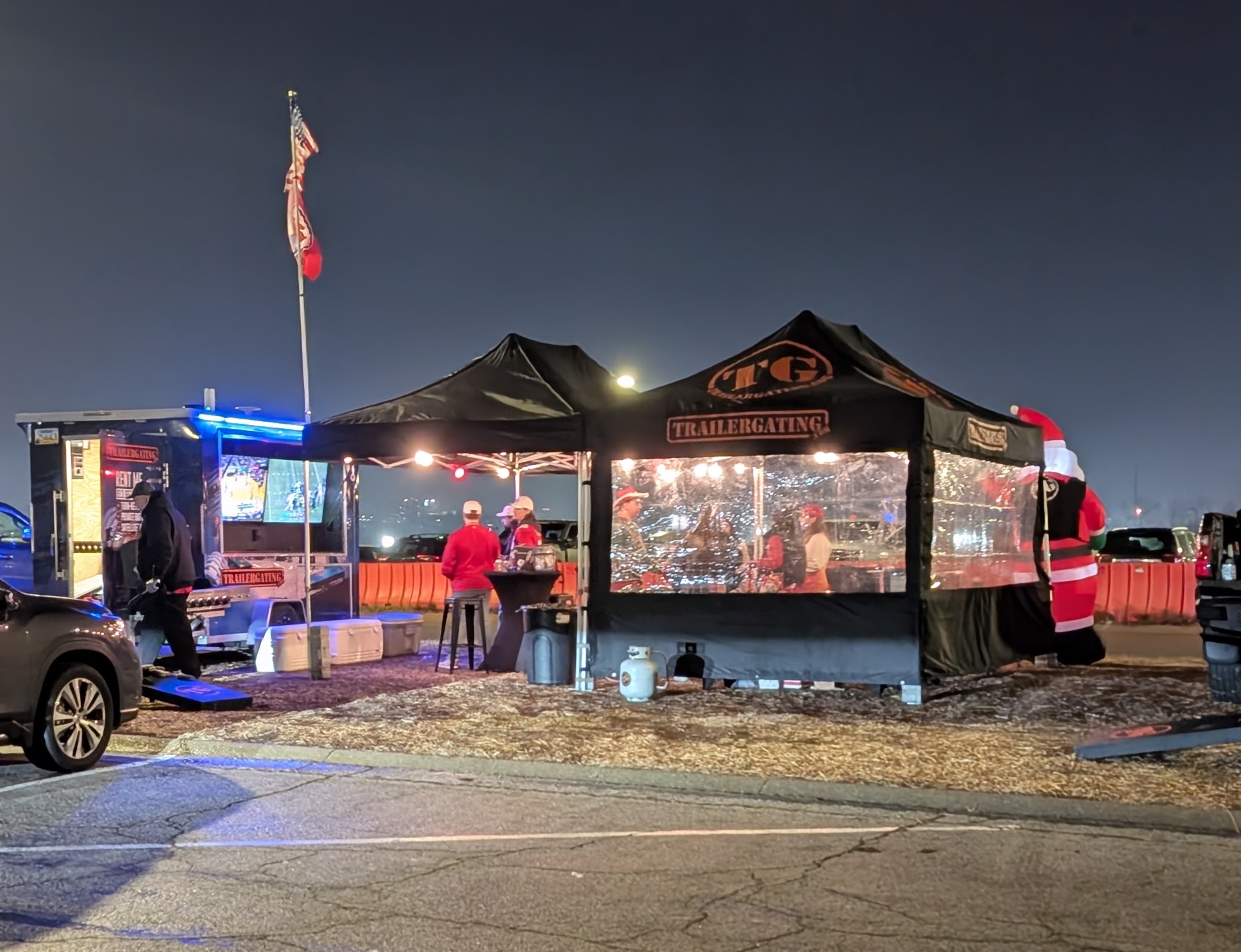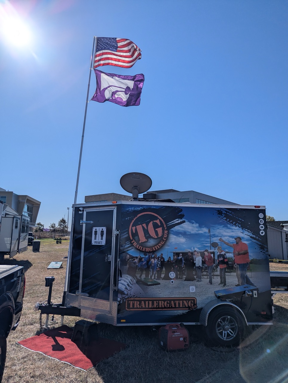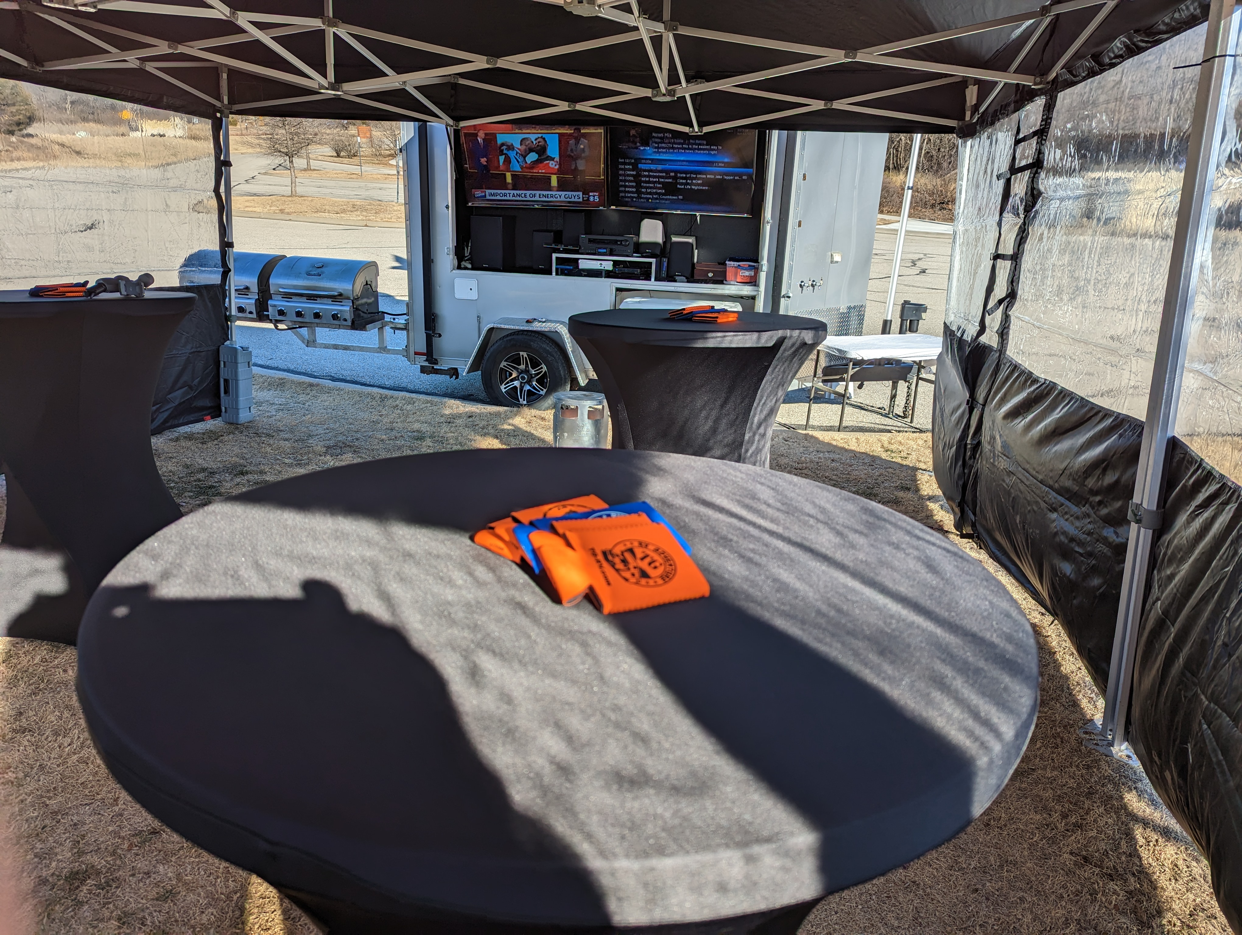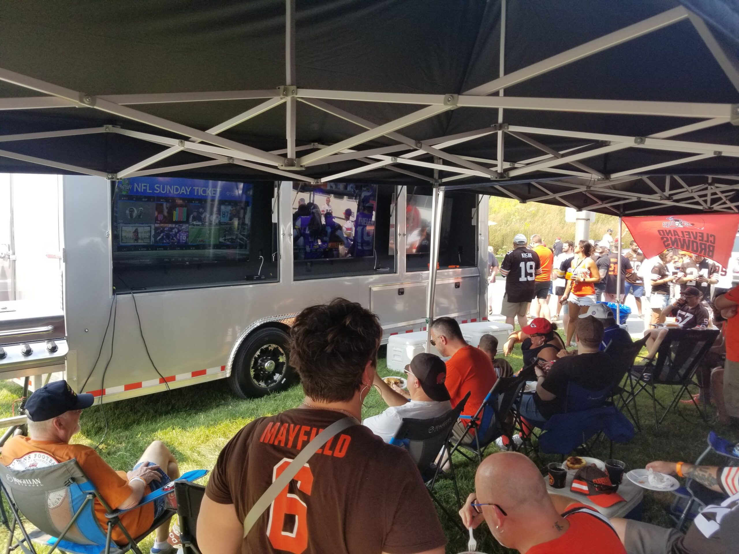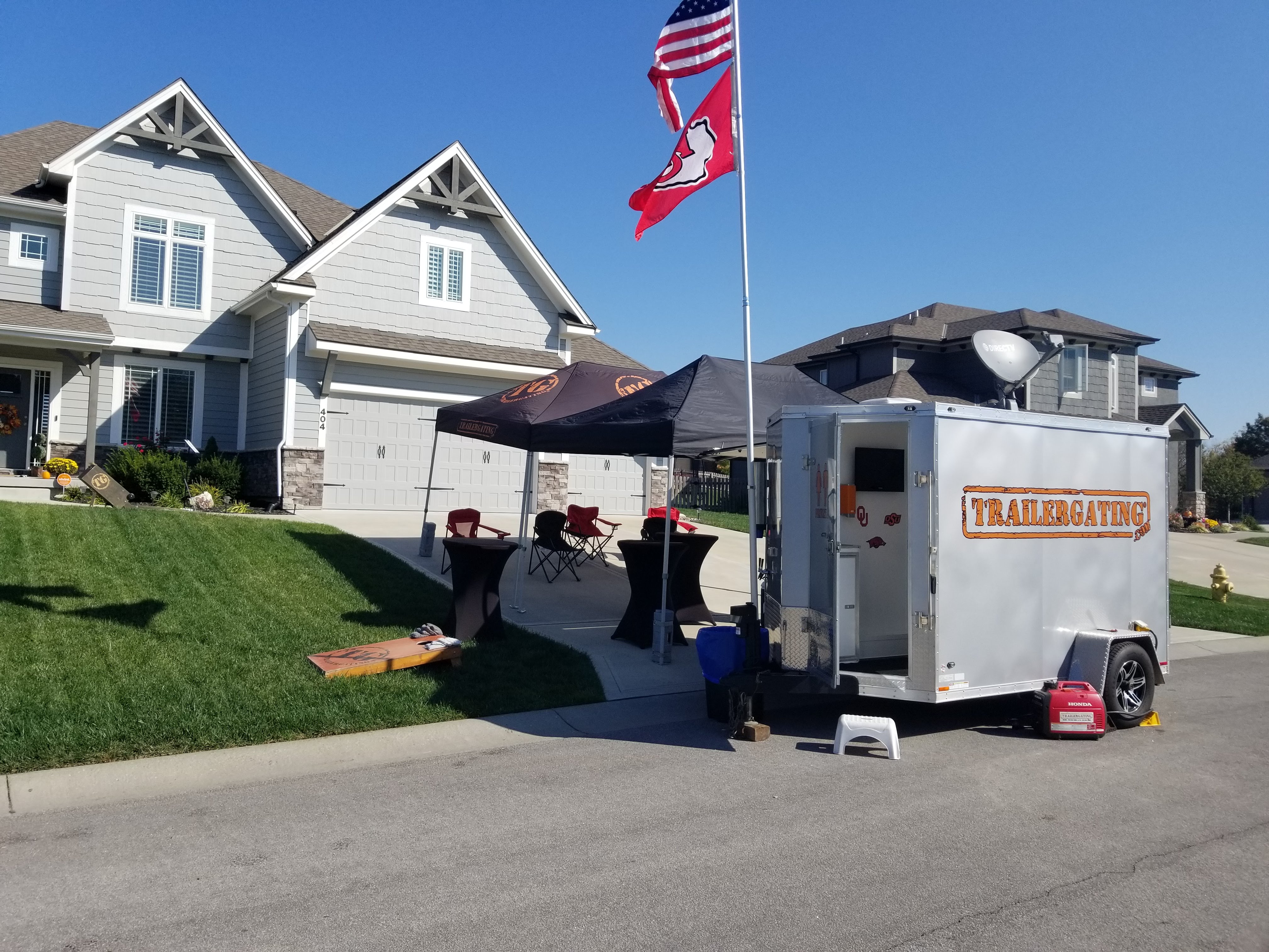 Recommended for events with 40 or fewer guests. This Trailergating Ultimate Tailgate Experience trailer is 10′ long with a total of three TVs. This trailer comes equipped with your own private bathroom with hot and cold running water, two 4-burner gas grills, two beer taps, satellite TV, chairs, tent and tables. The Trailergating Ultimate Tailgate trailer is the life of the party and is the ultimate tailgate experience.