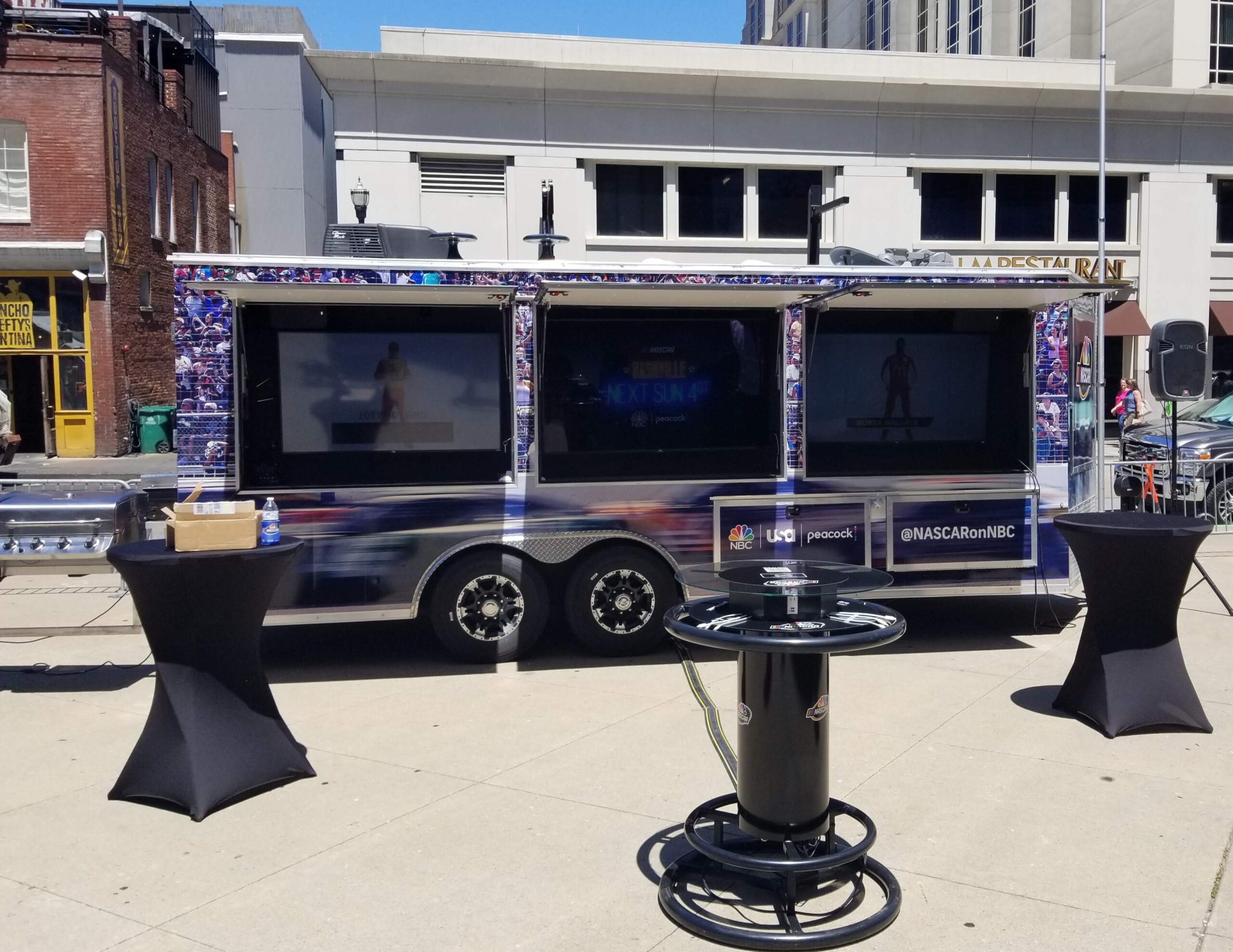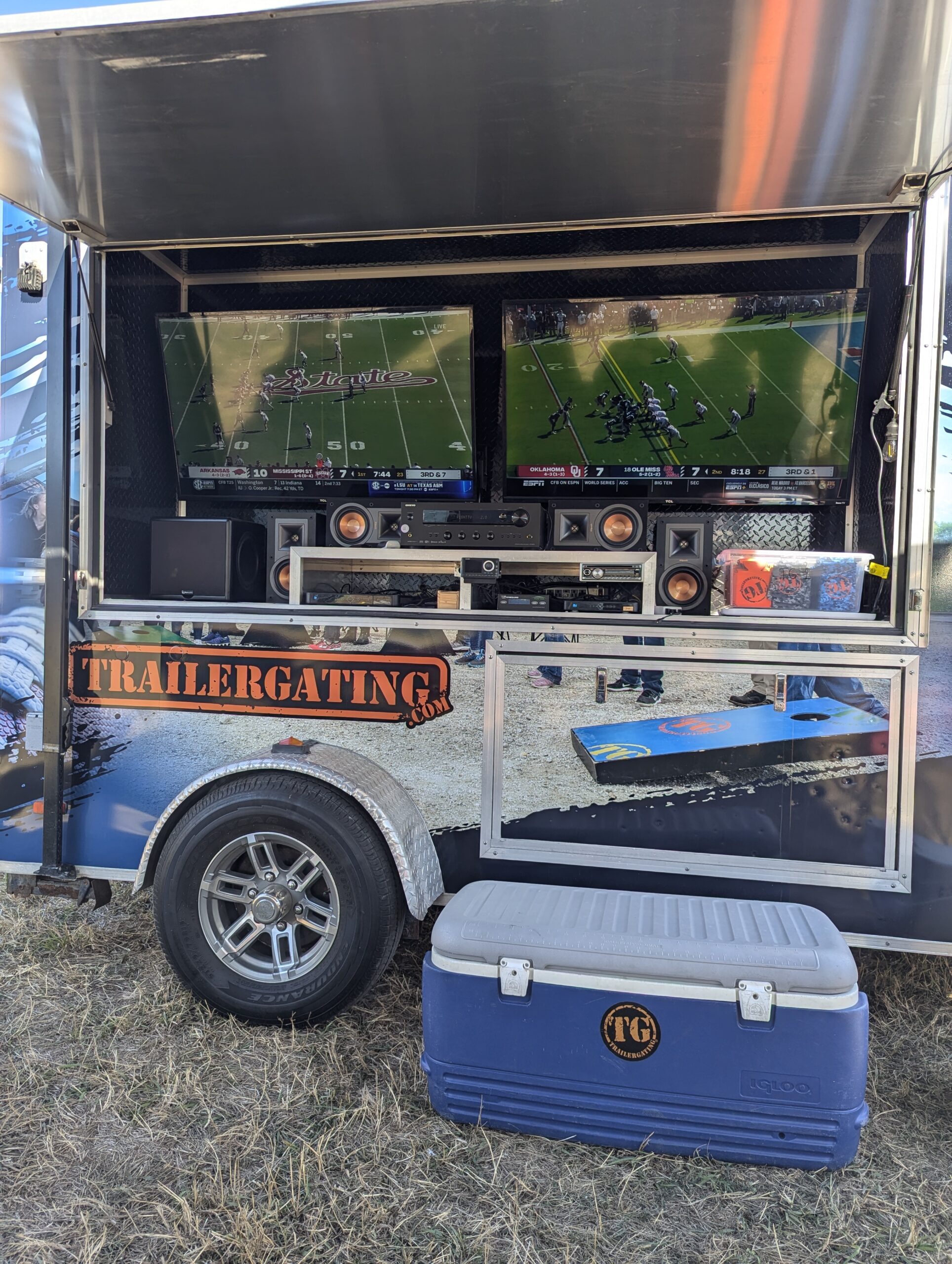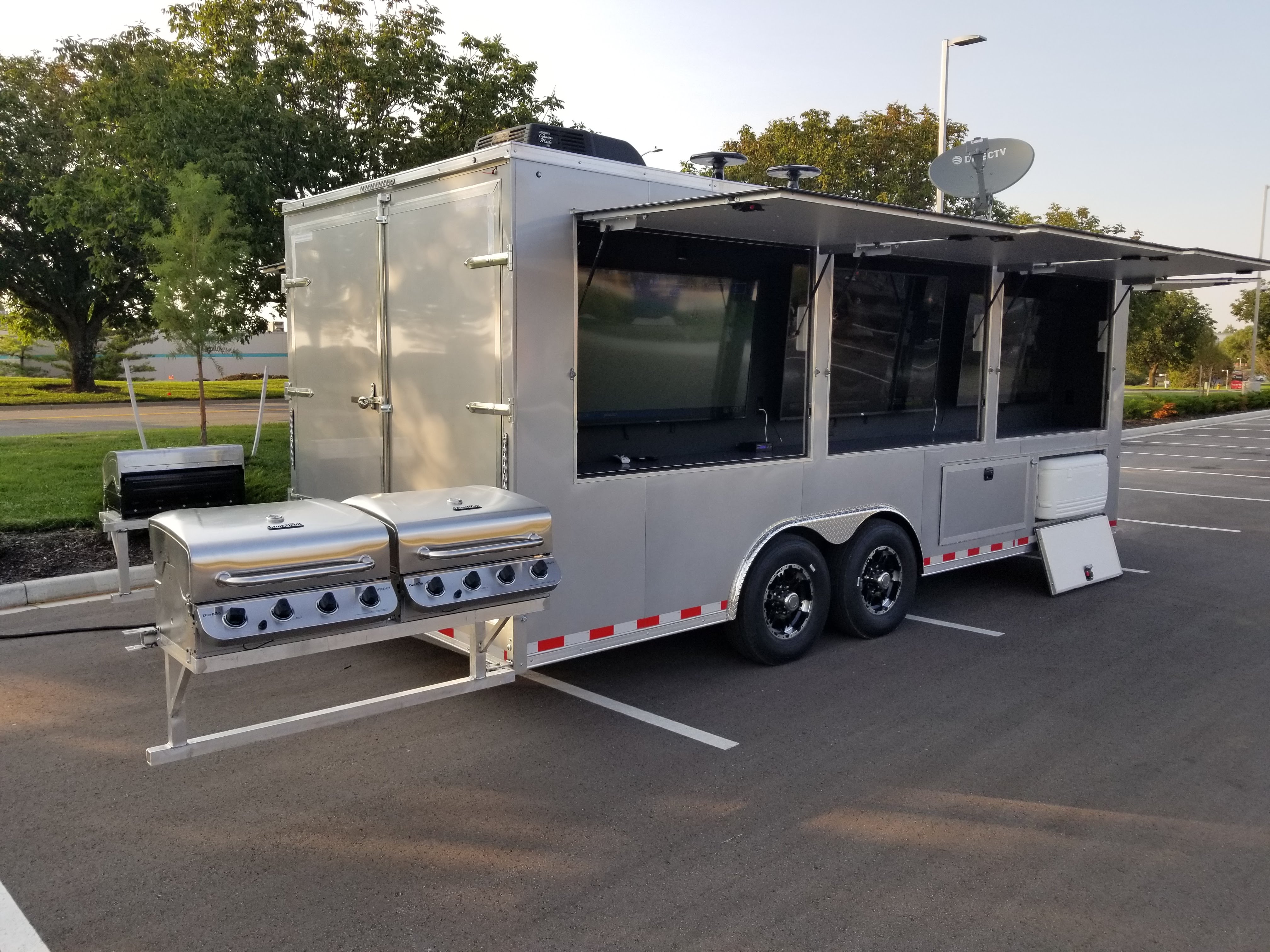 Recommended for events with 40 or more guests. The Corporate Event Trailer is 24′ long with a total of 8 TVs. Including a 70″ TV, three 55″ TVs and four more TVs to add to the experience. This trailer comes equipped with two private air conditioned bathrooms, three 5-burner gas grills, and two beer taps in the bar window. The Trailergating Corporate Trailer is a show stopper and beyond an ultimate tailgate experience.